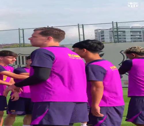 巴萨球员在训练课列队用拍头礼祝贺德容续约、费尔明伤愈归队