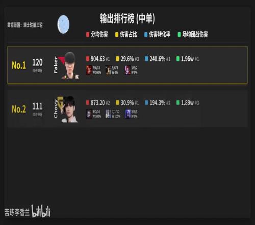 Faker唯一分均伤害破900,Chovy综合输出排名第二。